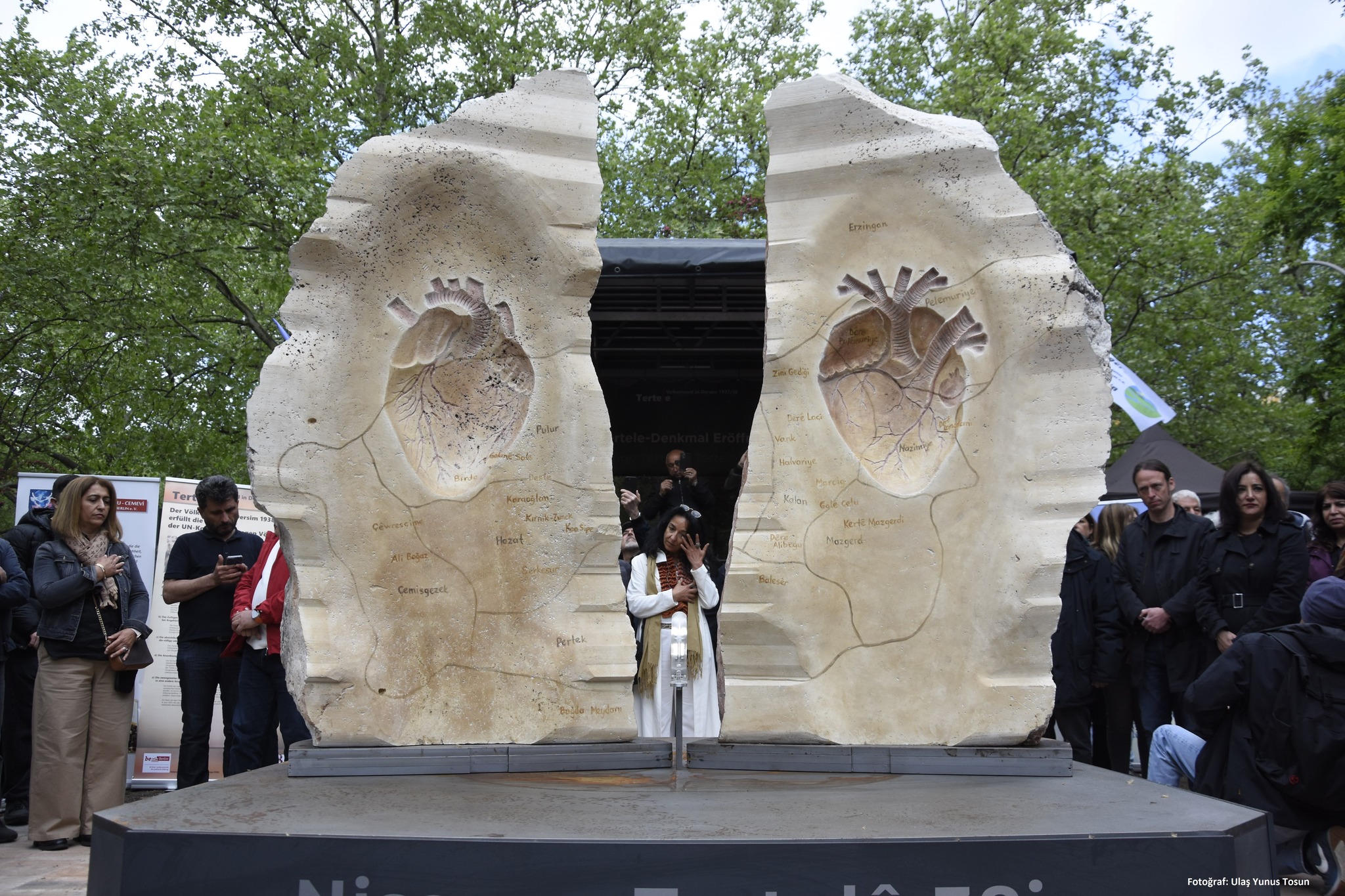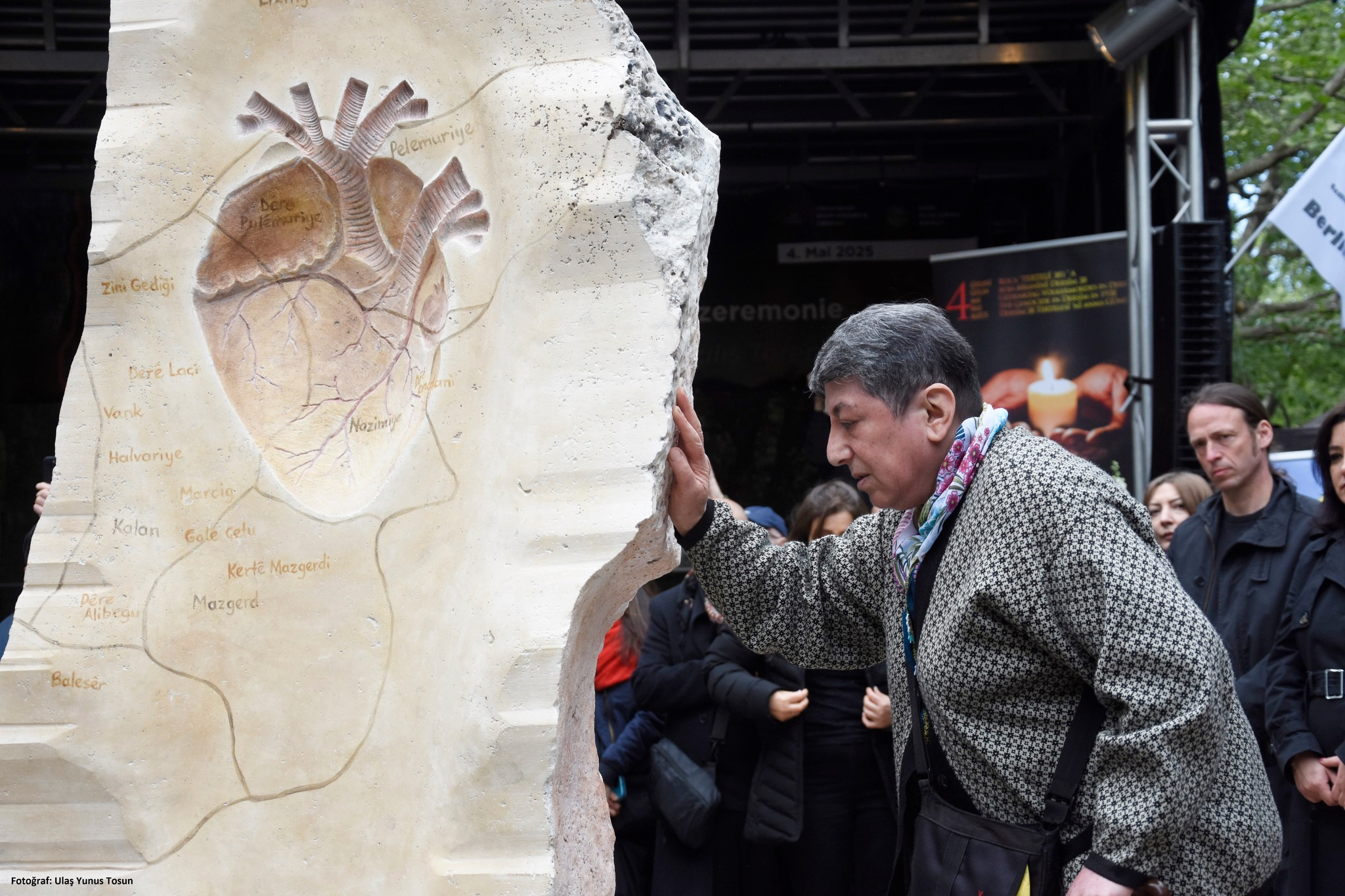 This monument is made from a large stone brought from Hozat, a site marked by the 1938 Dersim massacres. The stone becomes a vessel for memory, carrying collective trauma across geographies and into the present.