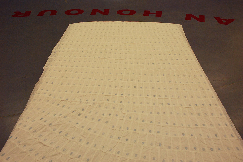 – Çarşaf (turkish for bed sheet, but also head scarf, cigarette paper) made of cigarette papers attached with saliva. – Videoprojektion film “Farinelli” (Il Castrato).